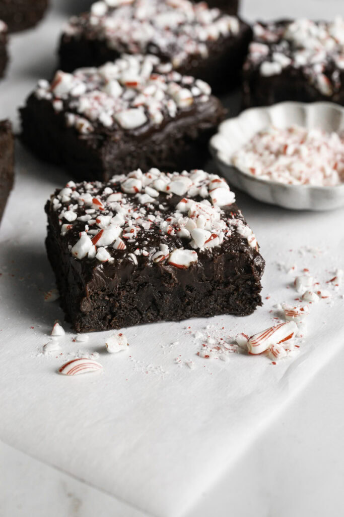 - Pour the chocolate ganache frosting evenly over the brownies, tilting the pan to cover the entire surface. Allow the ganache to set up for 20 minutes and then sprinkle the crushed candy canes over the chocolate ganache frosting. Continue to allow the ganache to set up by placing the brownies in the fridge for 30 minutes. Slice into whatever size squares you’d like and serve!