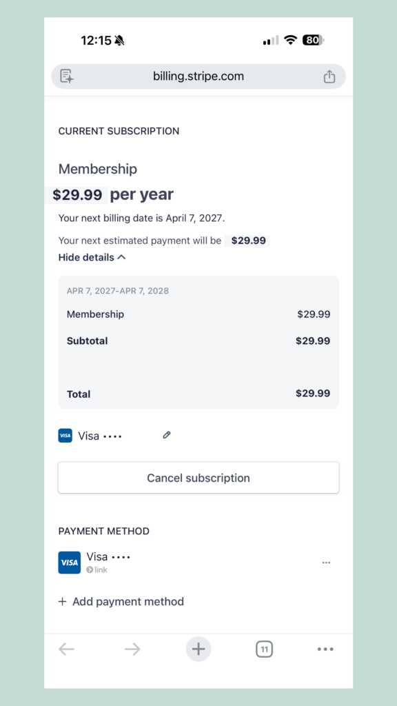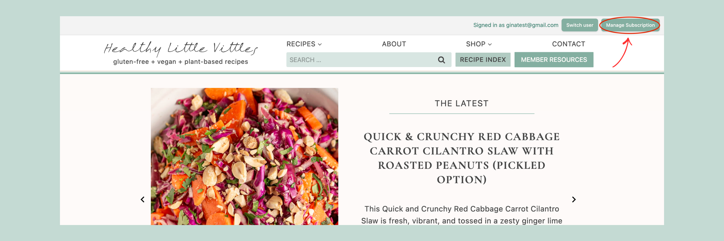 When you’re logged in on the site, there should be a light gray bar at the top that says “Signed in as (your email)”. Click on “Manage Subscription“. There will be a button to cancel your membership or update your payment method.