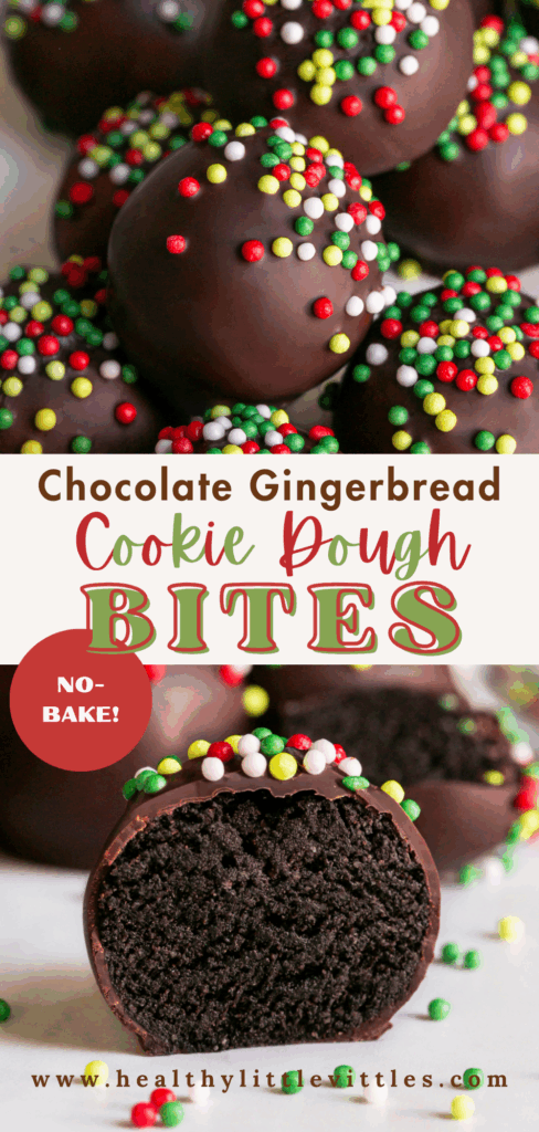 - Working with a few cookie dough bites at a time, dunk or roll each gingerbread cookie-dough bite into the melted chocolate. Gently tap off excess chocolate and place on a parchment-lined tray. Sprinkle with sprinkles of choice before the chocolate sets and then refrigerate for 15–20 minutes, or freeze for 5–10 minutes, until firm. Store in an airtight container in the fridge for up to a week.