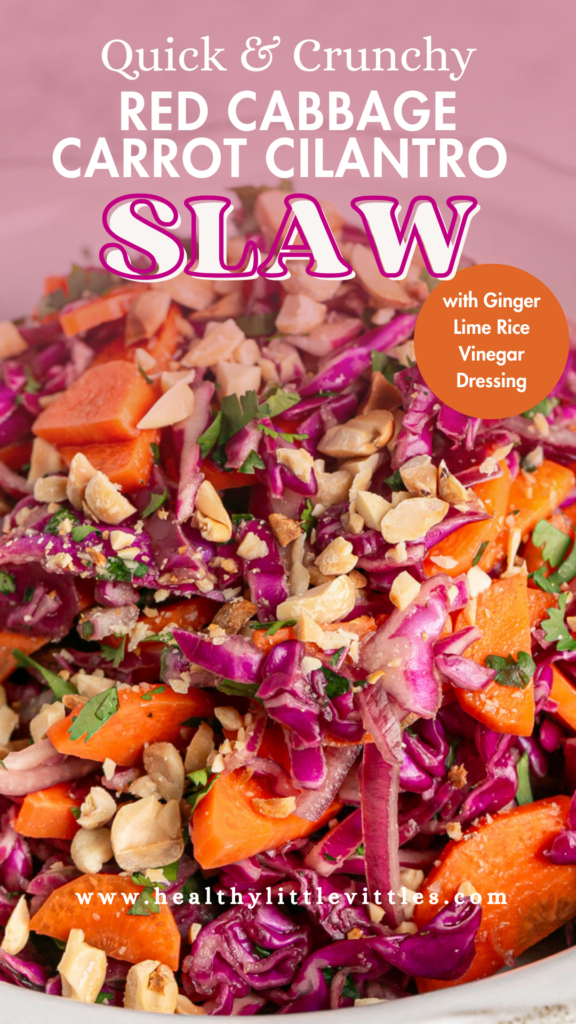 This Quick and Crunchy Red Cabbage Carrot Cilantro Slaw is fresh, vibrant, and tossed in a zesty ginger lime rice vinegar dressing. Top with roasted peanuts for an irresistible crunch! Includes an easy pickled option for deeper flavor.