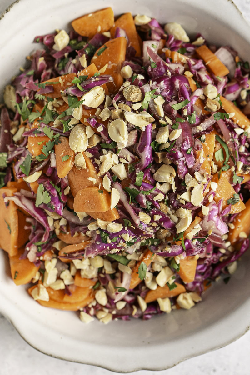 Garnish. Toss in the roasted peanuts right before serving or serve the slaw into bowls and top with chopped roasted peanuts.
