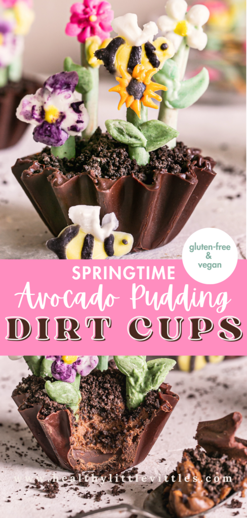 Now, don’t let the flowers scare you away from making this Springtime Chocolate Avocado Pudding Dirt Cup recipe… although they are super fun, you can certainly skip making the flowers and bees part and go with the good ol’ gummy worms instead 😜. The chocolate avocado pudding topped with vegan, gluten-free Oreos is delicious in itself. AND if you don’t want too much of a chocolate overload you can skip the chocolate shells as well. Like I said, I had a super cute vision and I went for it.