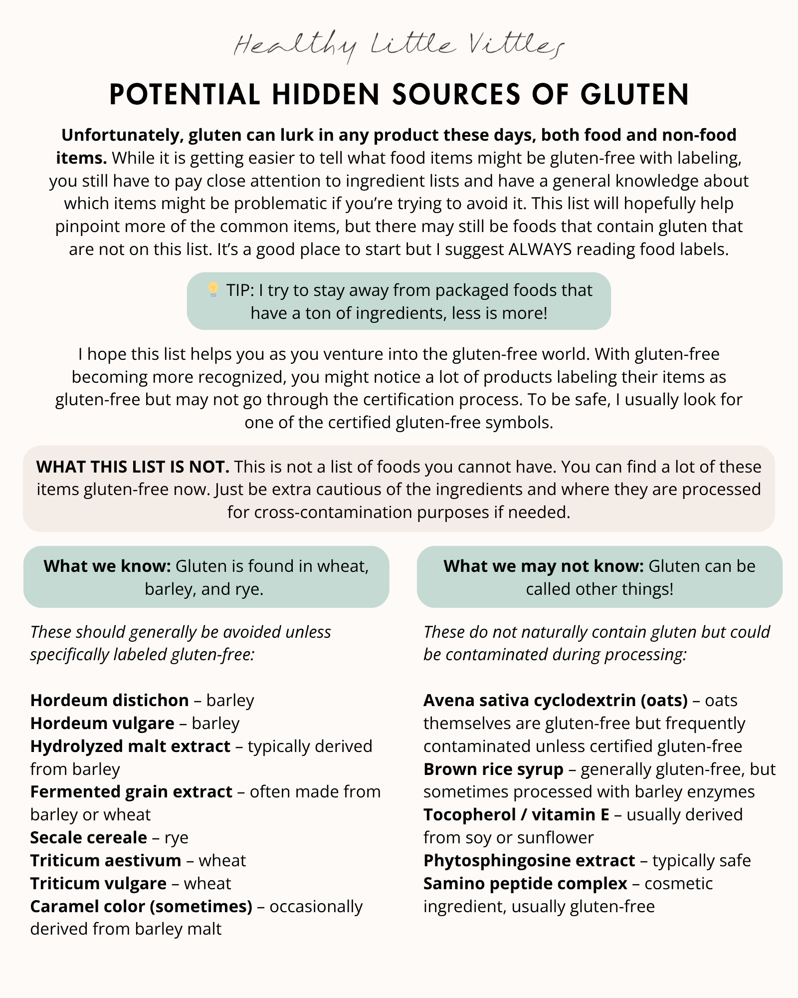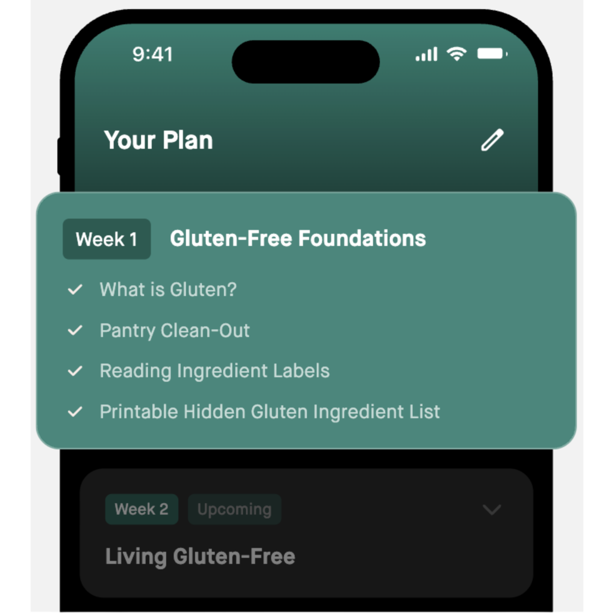 Receive a step-by-step gluten-free transition plan tailored to you, including ingredient lists, safe brands, and helpful guides.