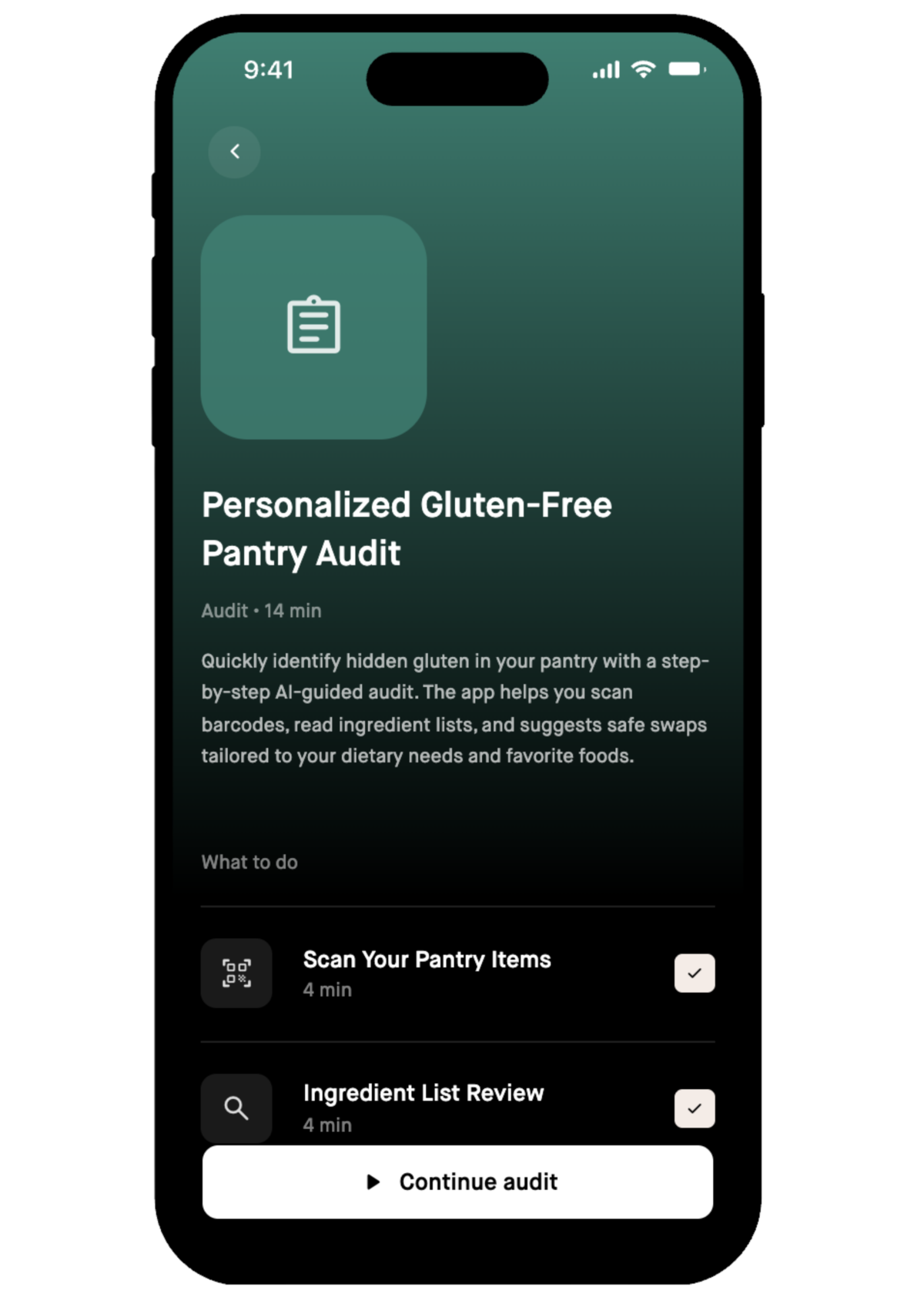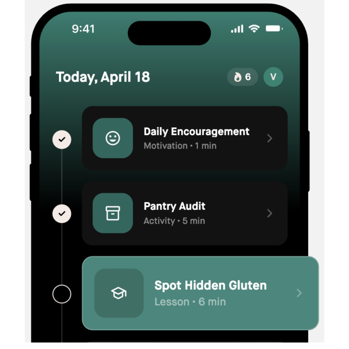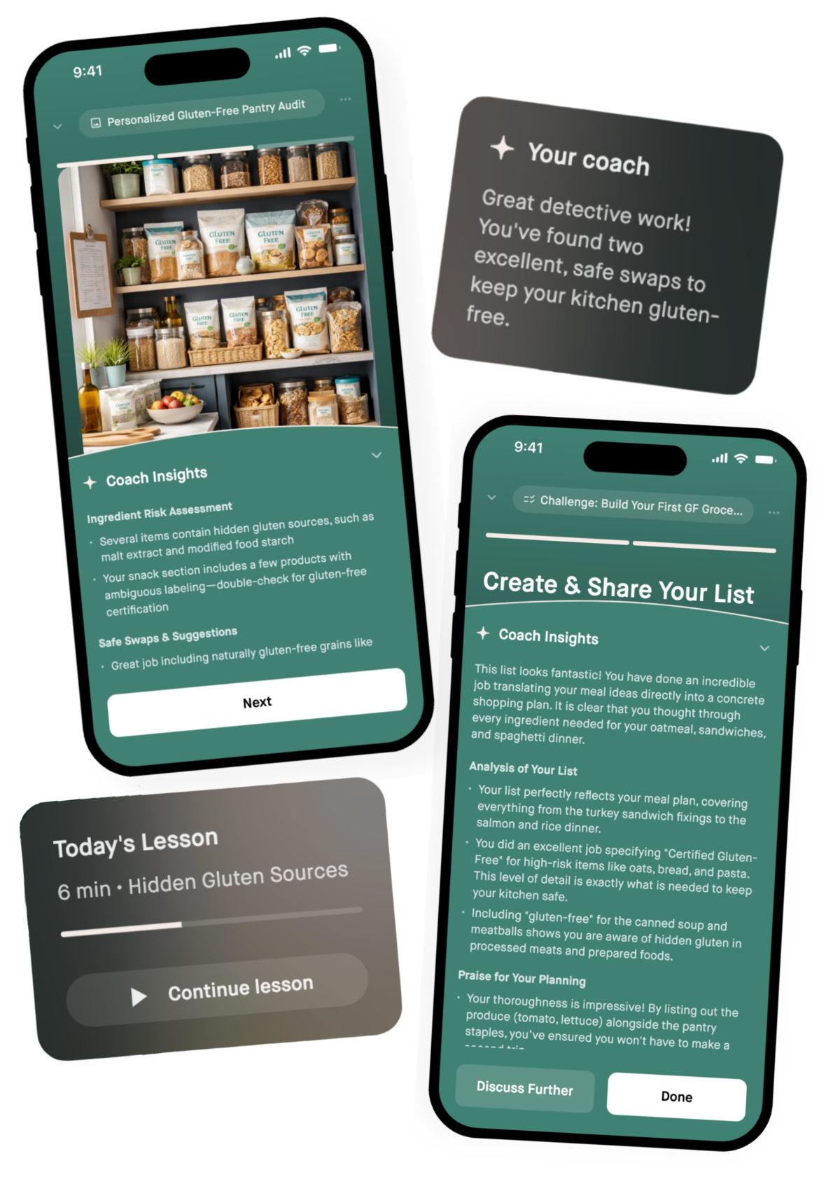 Your daily lessons, pantry audits, and meal plans adapt to your dietary needs, favorite foods, and lifestyle. Each session guides you step-by-step through the gluten-free transition with practical, personalized support.