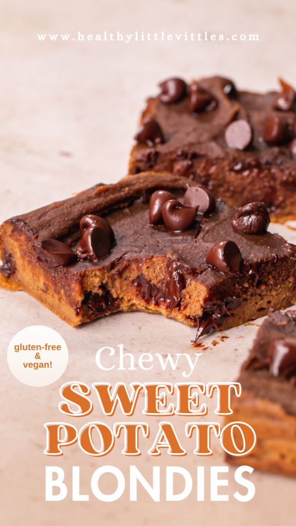 These Chewy Vegan Chocolate Chip Sweet Potato Blondies make a great healthier dessert option for when you have a sweet tooth but don’t want a sugar high. Be sure to leave a comment below down below in the comments section, as well as giving it a ⭐️⭐️⭐️⭐️⭐️ rating so that others can discover this easy plant-based, gluten-free dessert recipe! Tag me on Instagram, Facebook, or Pinterest!